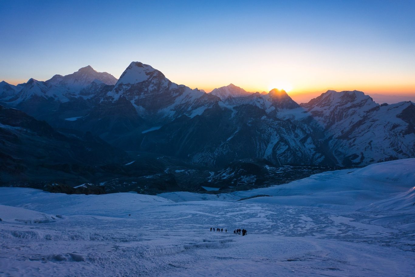 Früher Start vor Sonnenaufgang, anspruchsvoller Aufstieg über Gletscher und steile Schneeflanken, Trittsicherheit und Erfahrung im Umgang mit Steigeisen erforderlich, am Gipfel erwartet ein überwältigendes 360°-Panorama der höchsten Berge Nepals