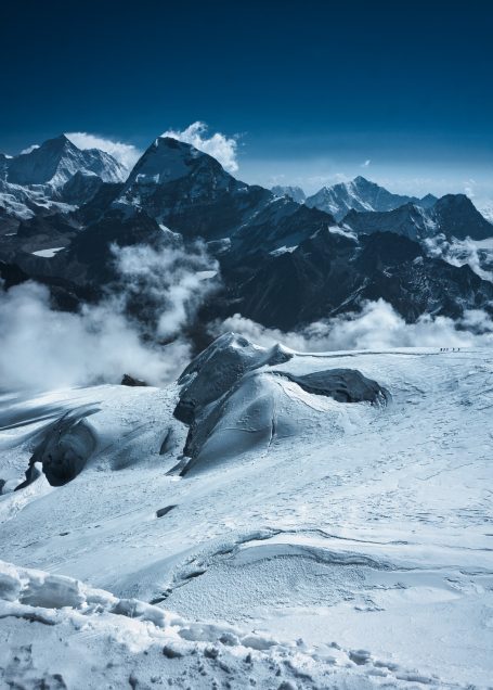 Der Anstieg zum Mera Peak erfolgt in mehreren Etappen mit zwei Hochlagern - dem Mera La Camp (5.350 m) und dem High Camp (ca. 5.800 m). Der technisch einfache, aber konditionell fordernde Aufstieg führt über vergletscherte Hänge mit moderater Steigung. Die letzten Meter zum Gipfel erfordern Trittsicherheit und Erfahrung im Umgang mit Steigeisen und Seiltechnik. Oben erwartet Sie ein unvergleichliches 360°-Panorama über fünf der höchsten Berge der Erde.