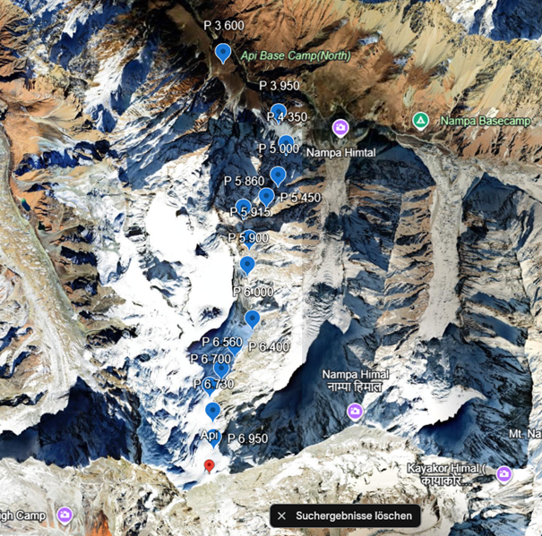 Api Himal 7.132 m - ungefähre Nordwestroute (Google Earth)